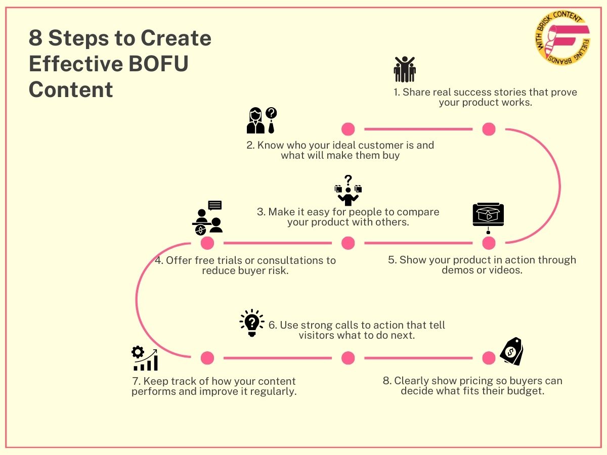 Here’s a simple step-by-step guide to help you create effective Bottom-of-the-Funnel (BoFu) content: